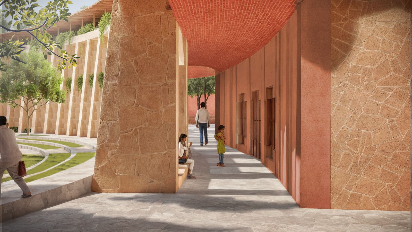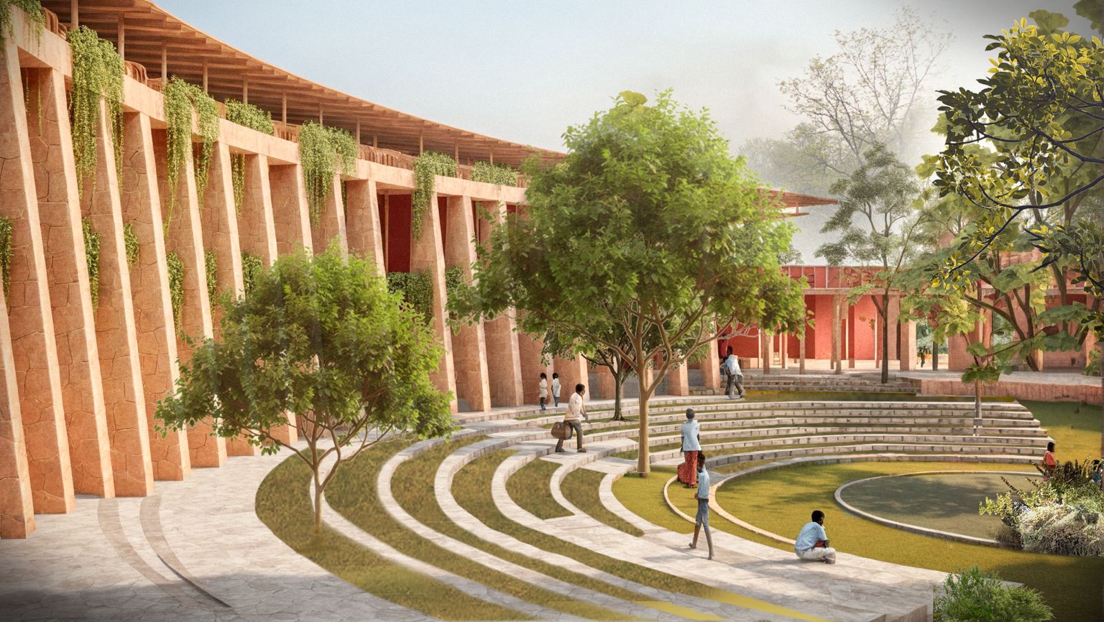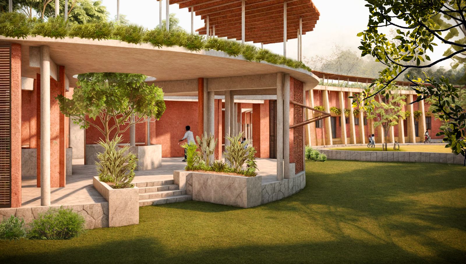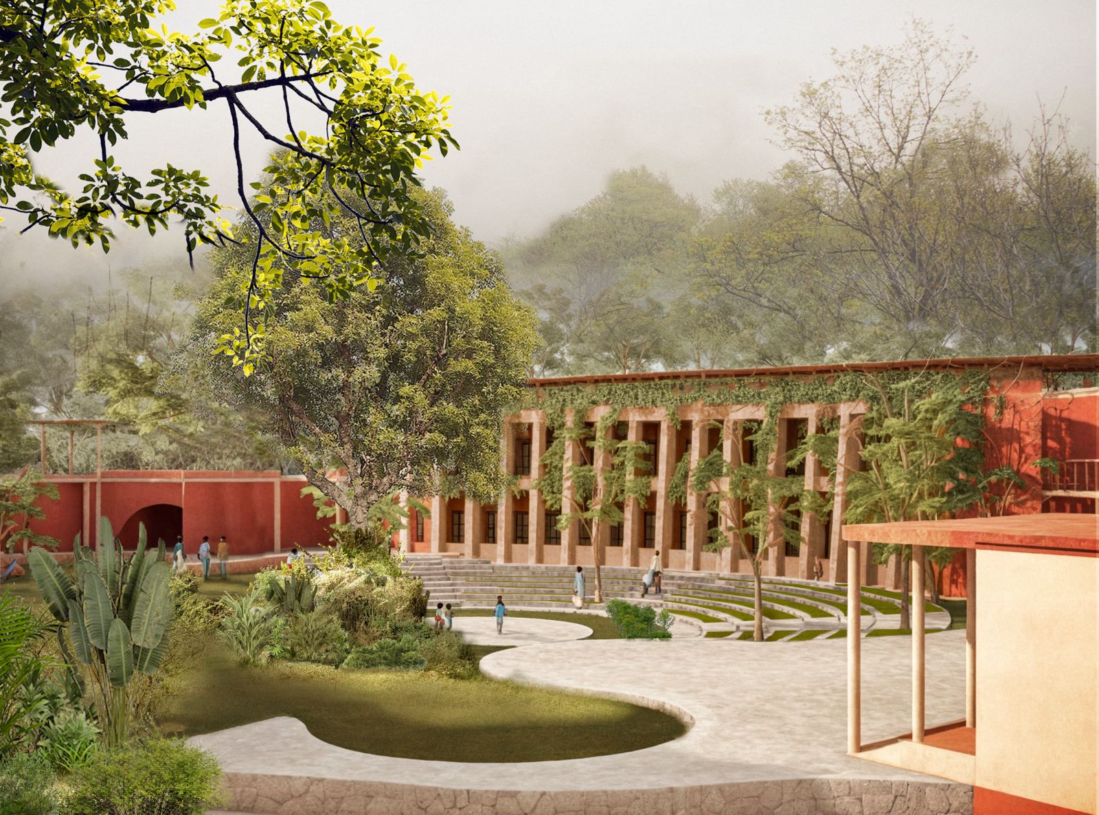 Centered around an ancient Neem tree, the school frames views of forests, farmland, and open wilderness. A natural entryway with free-grazing animals fosters early connections with biodiversity.